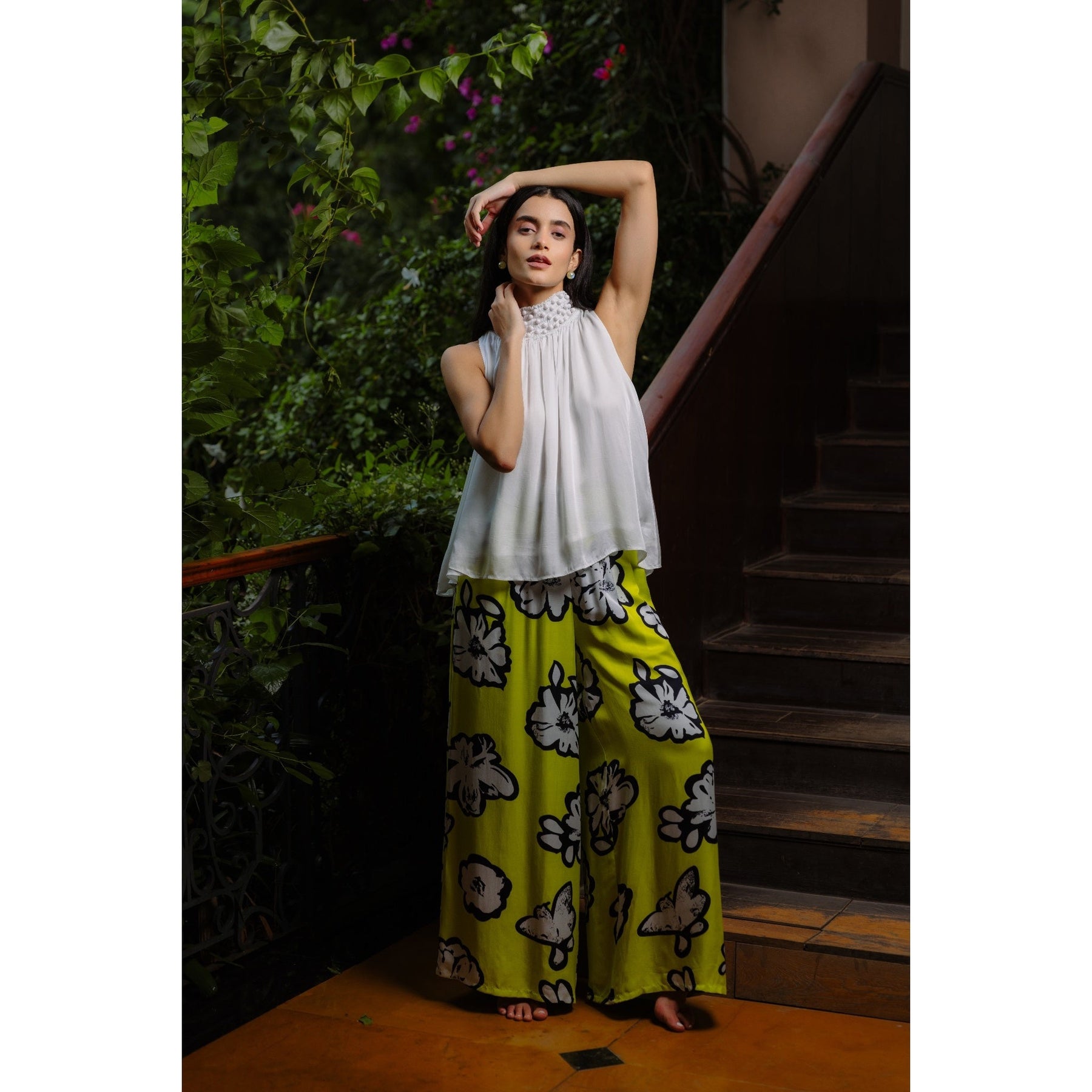 Viscose satin high neck tank with smocked neck panel adorned with tonal white rounded beads. Style is lined