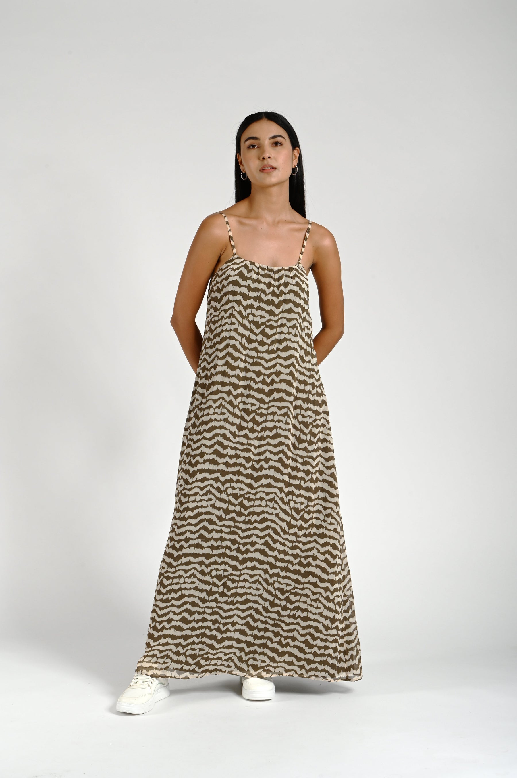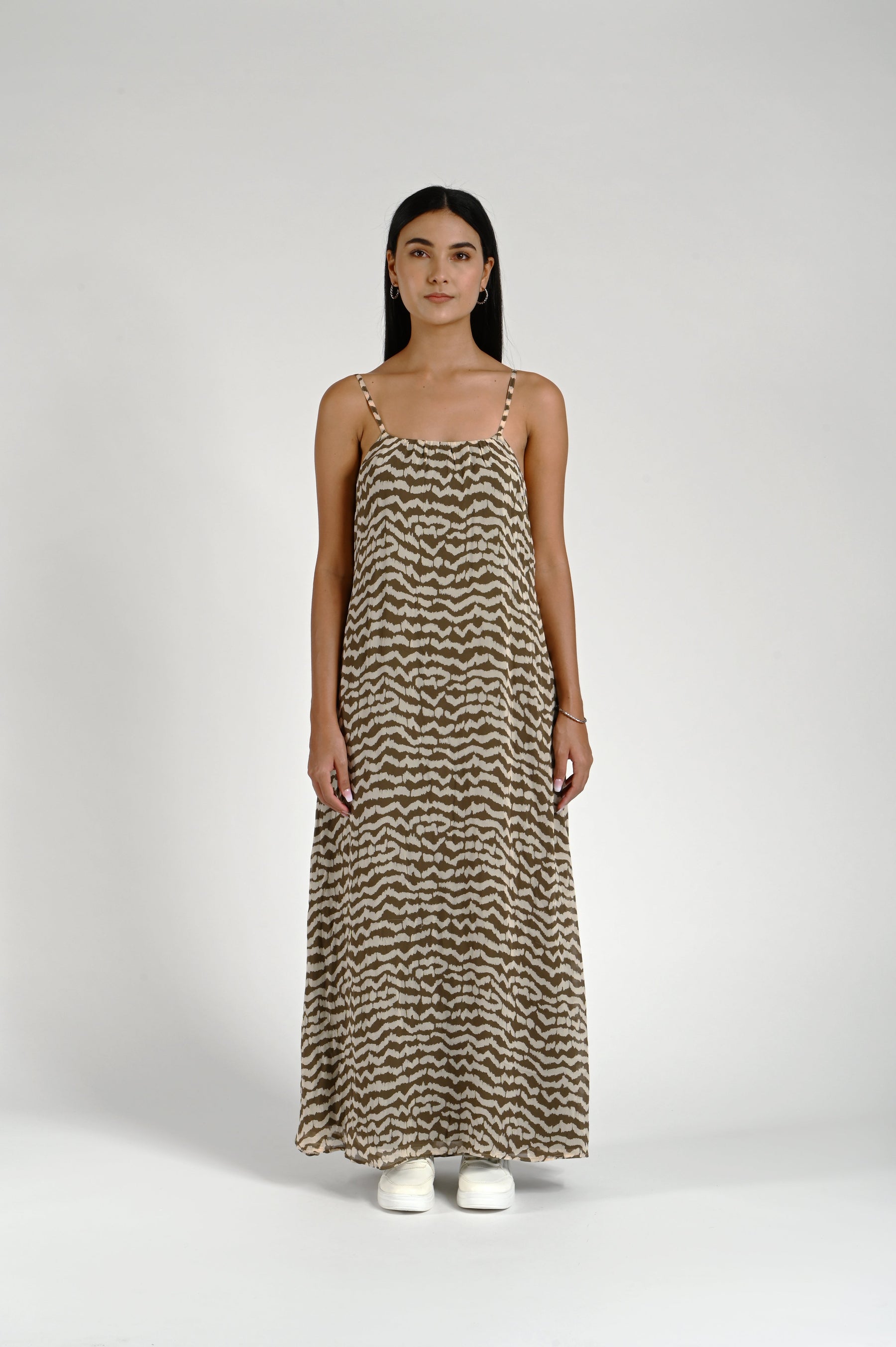 Viscose georgette abstract printed column maxi dress. Lined with adjustable shoulder straps.