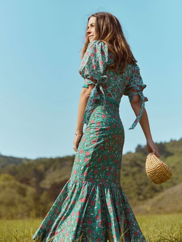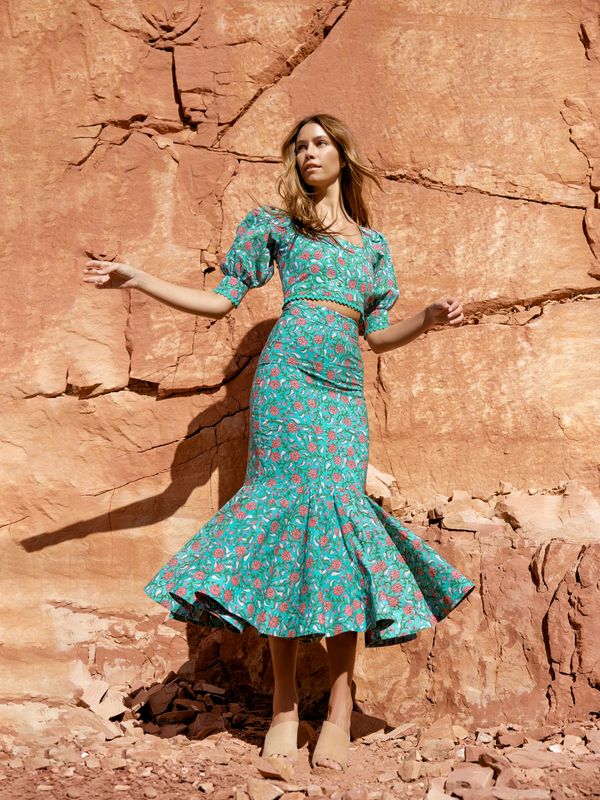 Patsy Fluted Pencil Skirt - Teal & Cerise Floral Print
