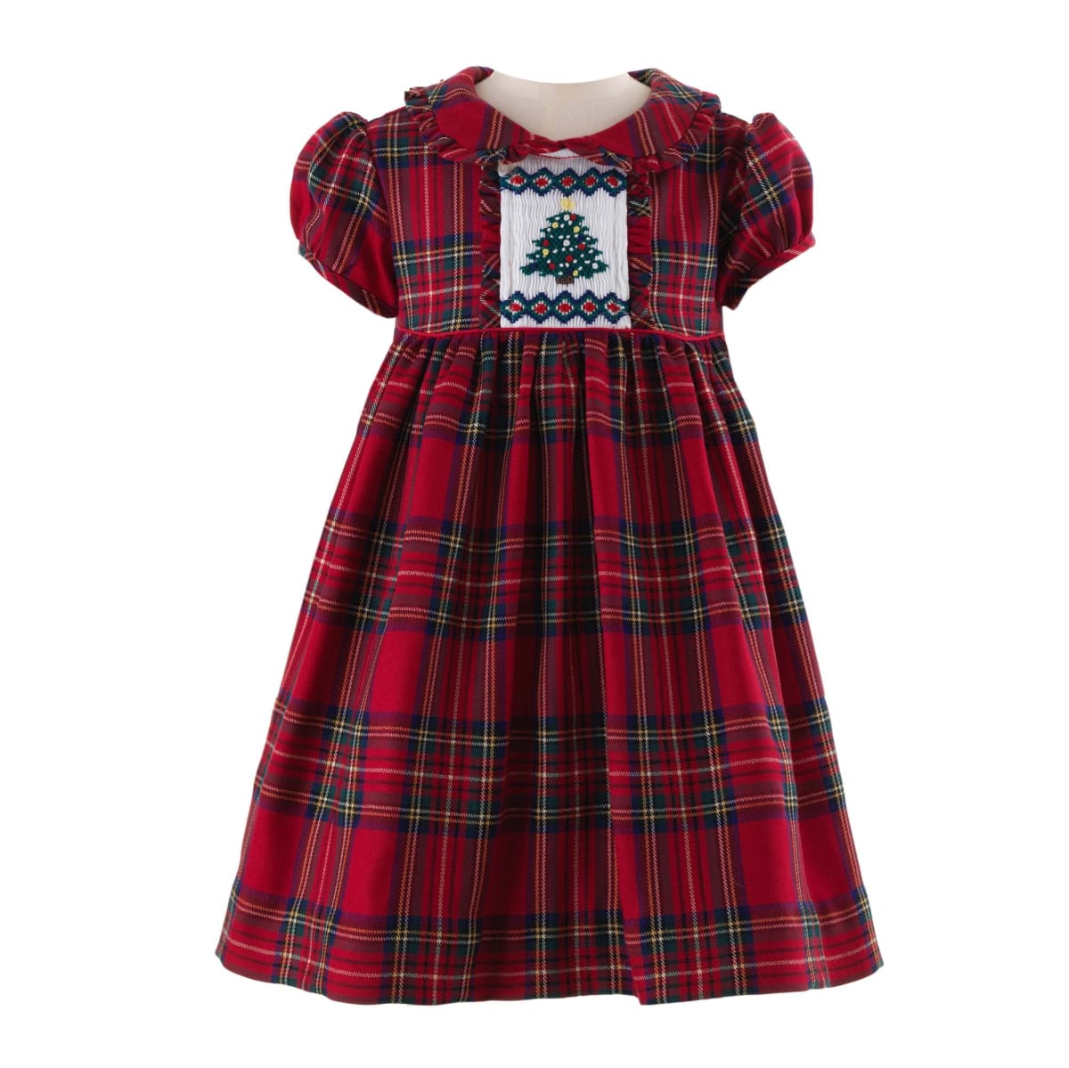 This festive tartan dress is designed in classic red and green tones with charming puff sleeves, a sweet collar, and delicate frill trims. The bodice features a beautifully hand-smocked Christmas tree detail, adding a special seasonal touch. Fully lined for comfort, it’s finished with a button-back closure and a sash tie at the waist, and comes complete with matching bloomers. Fabric: Shell: 80% Polyester / 17% Viscose / 3% Elastane Lining: 100% Cotton