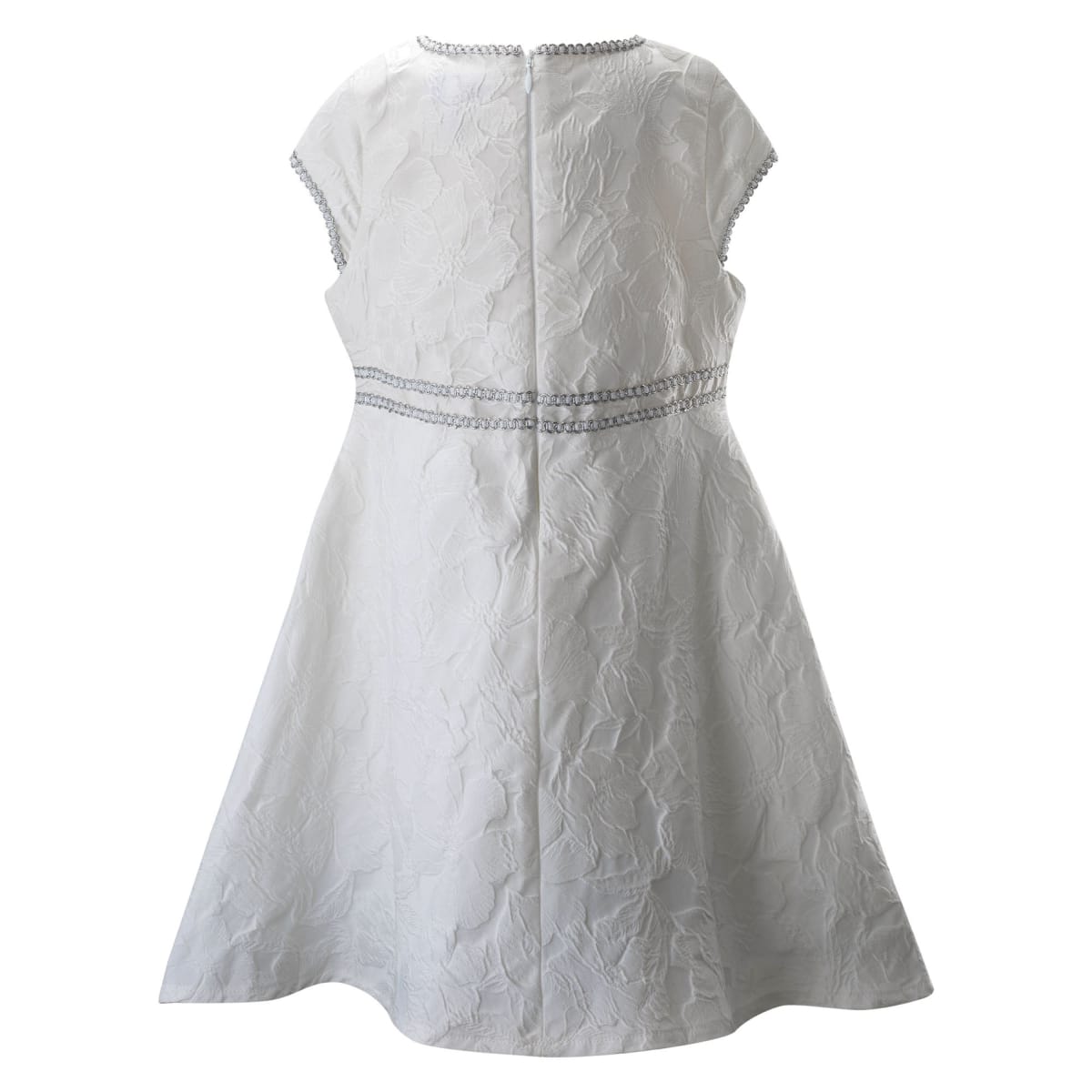Let your little girl shine like a diamond in our Sparkle Trim Damask Dress. This timeless A-line dress is the perfect mix of girly and sophisticated, with a beautiful white damask and delicate floral design. The silver sparkle braiding trim adds a touch of glamour to the neck line, cup sleeves, and waist. With zip closure at the back for a flawless fit. Perfect dress for flower girls!