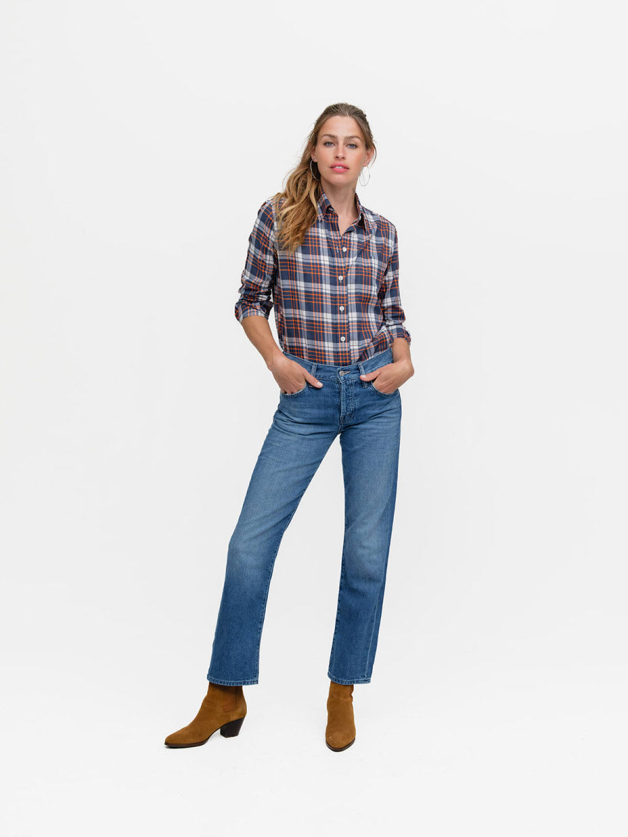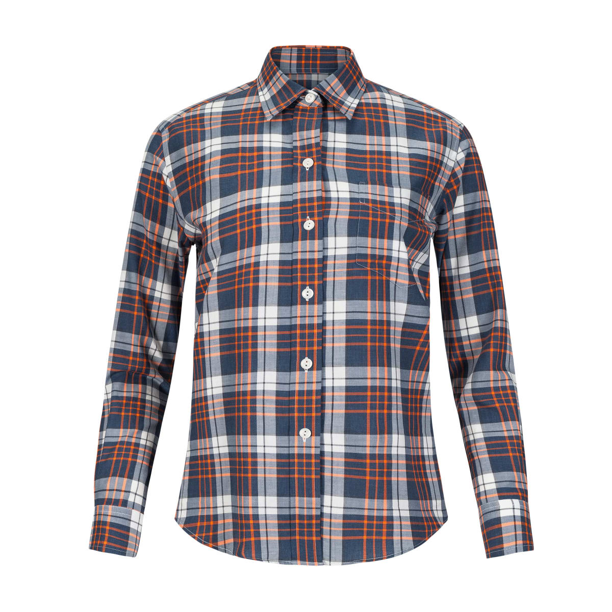 Our menswear inspired Weekend Shirt in a sophisticated blue, orange, cream plaid flanella.