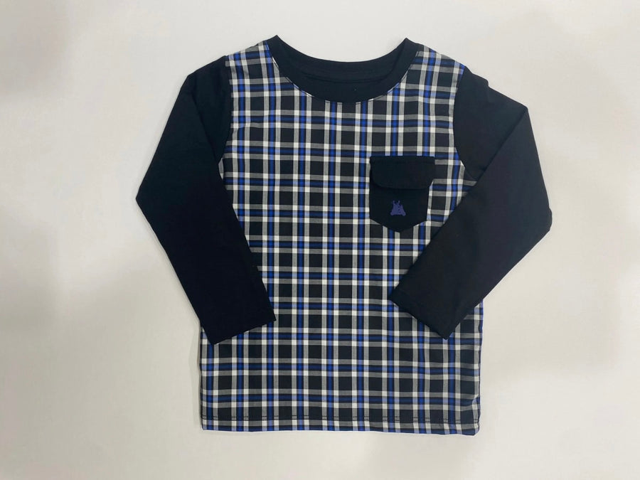 This boys' T-shirt combines soft jersey fabric on the front with a light blue and grey checkered shirt fabric for the collar, pocket square, and back. Made from 100% cotton, it offers a comfortable fit with a stylish color and pattern combination, giving it a trendy yet polished look.