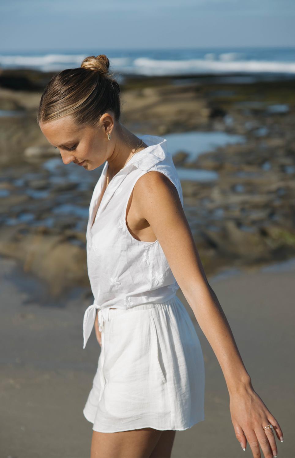 Meet the Sole Shirt: Sitano's take on the classic collared shirt - this crisp, sleeveless top features beautiful embroidery detailing, a flattering slim fit, and a chic tie at the waist. Wear it with your favorite denim cut-offs to get the perfect fresh, summer look.