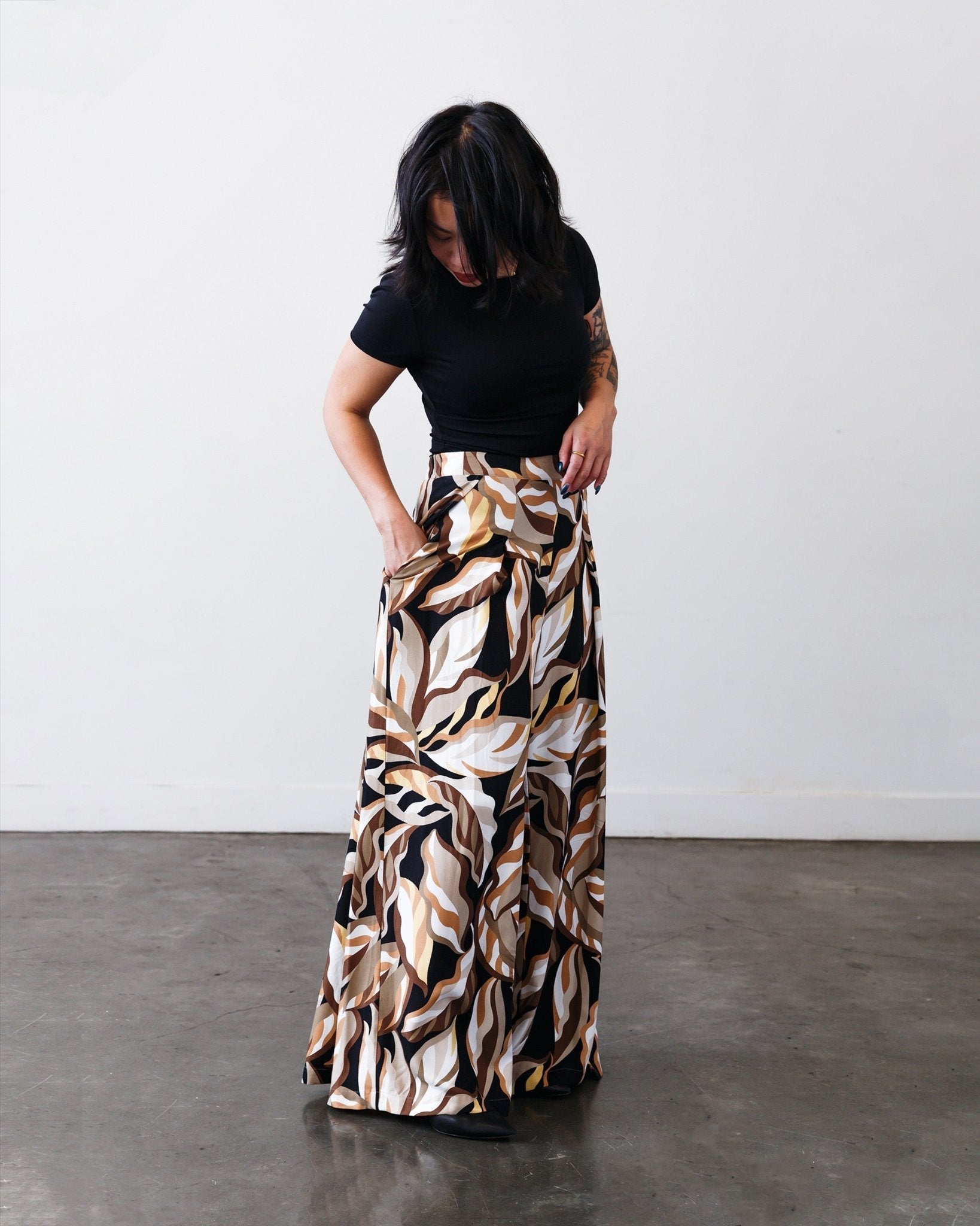 Our bestselling Sasha pant gets an update! Meet the Sarah pant - all the fun of our wrap pant with a full pant leg to keep you a bit warmer in the changing seasons. Hidden pockets in the side seam keep small personal items close without looking bulky. We added elastic to our back waistband for added comfort and flexibility. Made from our bold paint print on 100% viscose imported from France.