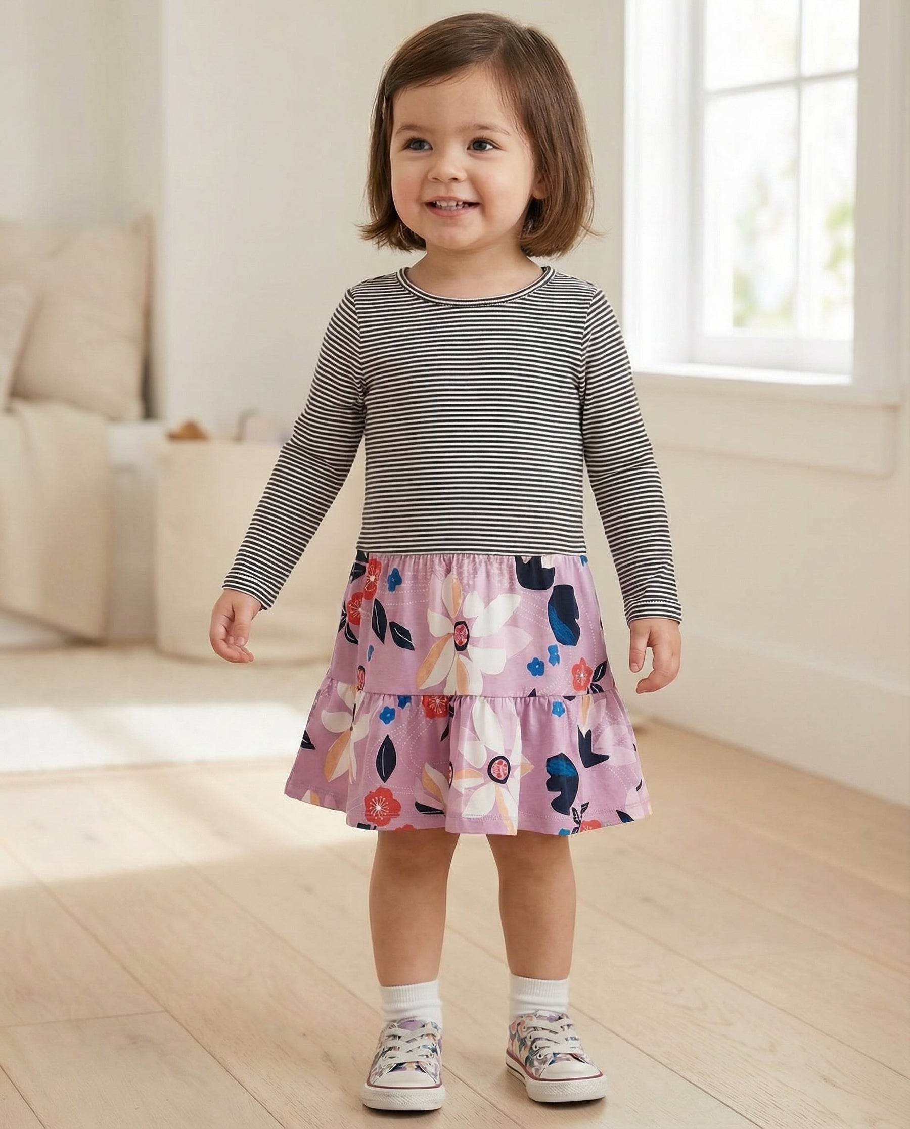 Sweet and sassy, this cute print mix dress combines two different prints, for a wonderfully fun dress. 100% cotton.